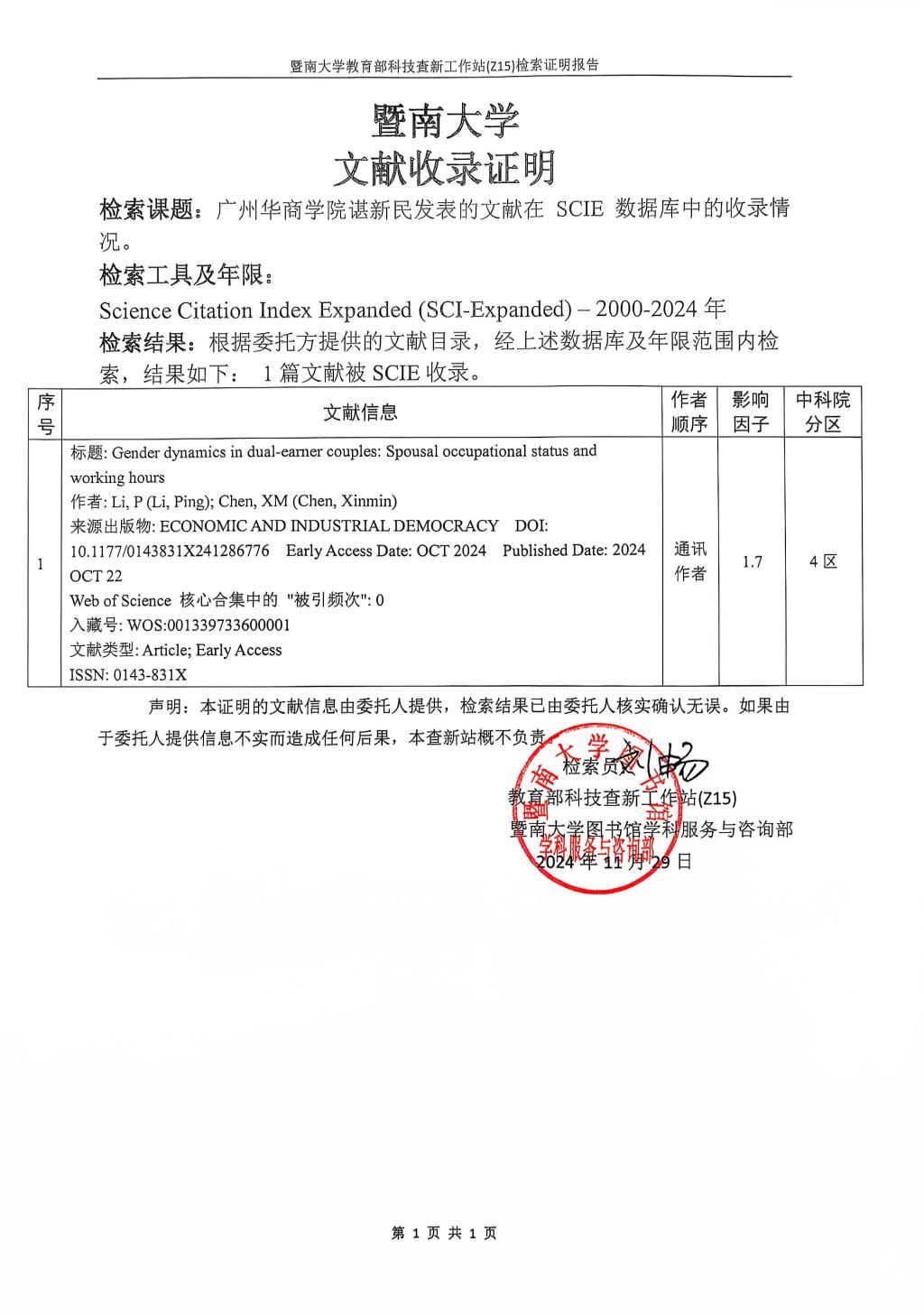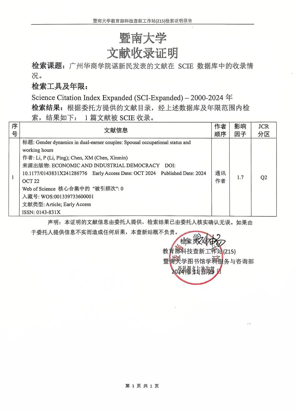 2024年10月,粤港澳大湾区研究院李萍教授(客座教授)、谌新民教授共同撰写的论文“Gender dynamics in dual-earner couples Spousal occupational status and working hours”在《Economic and Industrial Democracy》发表。